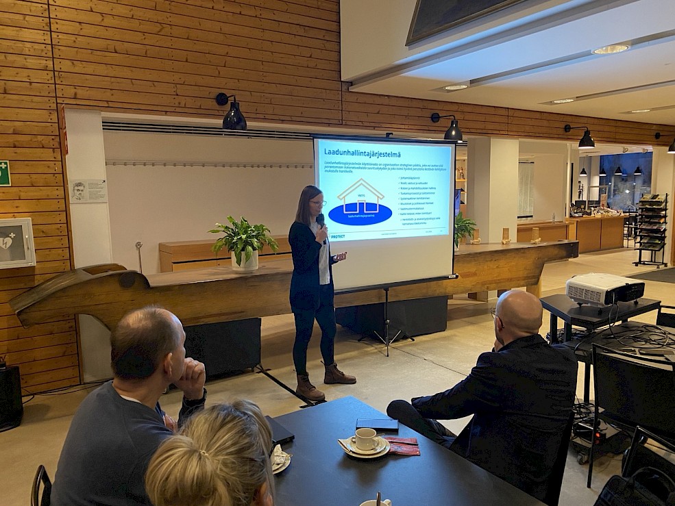 Saija Pottala, utvecklingschef på SK Protect, introducerade åhörarna till grunderna i ISO 9001 och ISO 27001 och presenterade PRO24 HSEQ-systemet som utvecklats av Protect. Saija Pottala betonade att ISO-standarderna för ledningssystem har utformats för att passa företag av alla storlekar.
